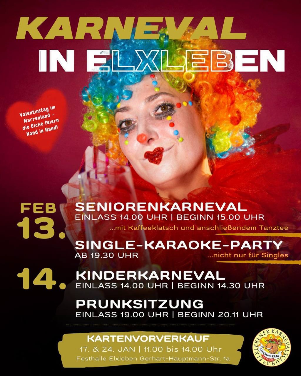 Dass der Valentinstag in diesem Jahr auf das Wochenende des karnevalistischen Höhepunktes fällt, werden die Elxlebener Närrinnen und Narren zum Anlass nehmen, eine große Portion Liebe durch die Festhalle wabern zu lassen. „Valentinstag im Narrenland – die Elche feiern Hand in Hand“ lautet folgerichtig das Motto.