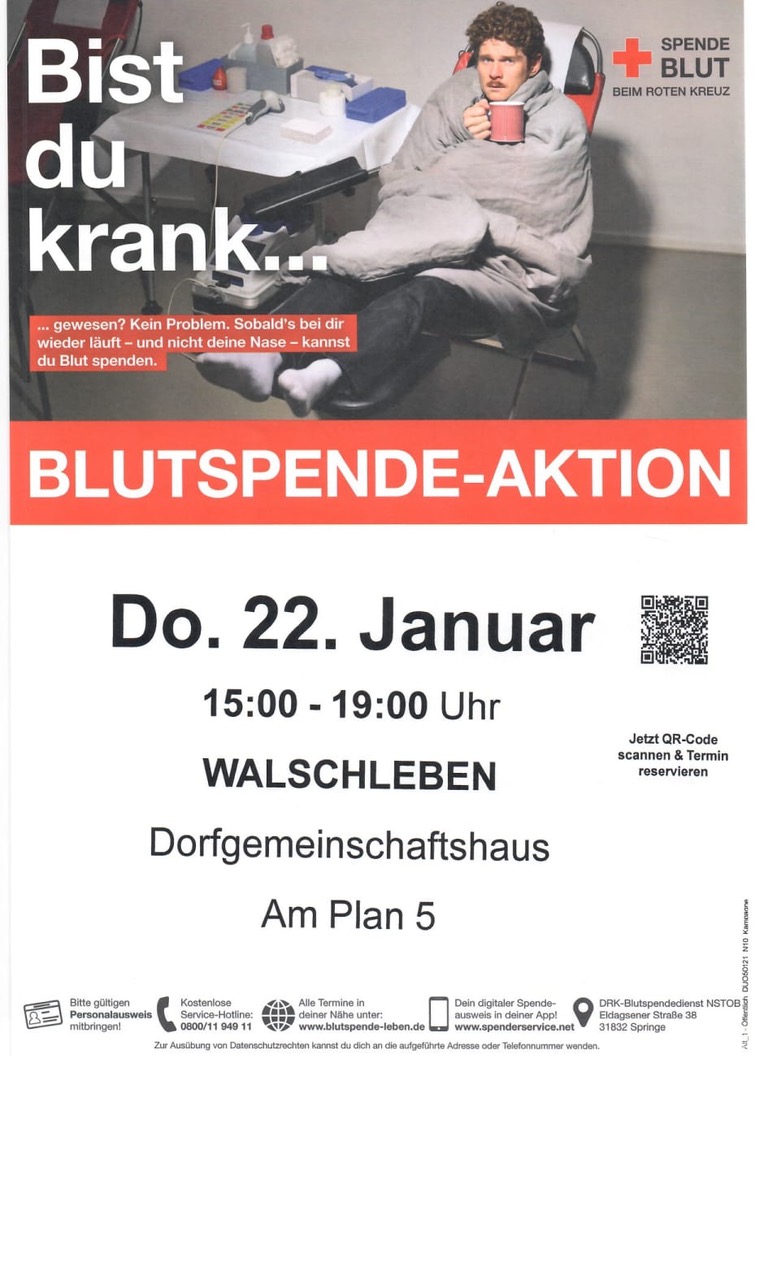 Am Donnerstag, 22. Januar findet im Dorfgemeinschaftshaus Am Plan 5 eine Blutspendeaktion statt, alle Interessierten sind von 15 bis 19 Uhr herzlich willkommen.