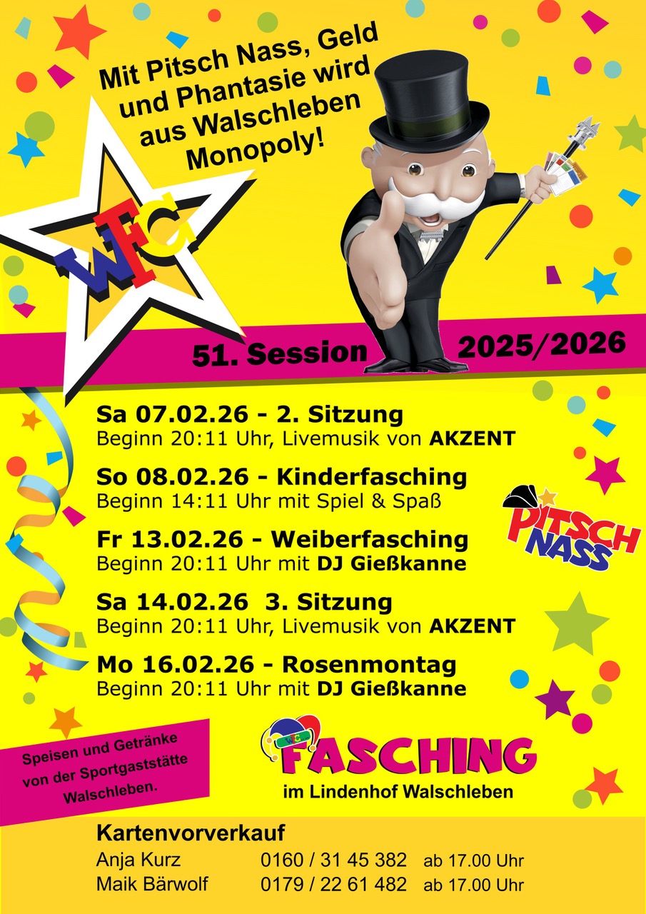 Die Walschlebener Karnevalisten starten in ihre nunmehr 51. Saison. Unter dem Motto „Mit Pitsch nass, Geld und Phantasie wird aus Walschleben Monopoly.“ Gab es bereits zur Eröffnung im November ein vielseitiges Programm rund um einen klassischen Spieleabend, das die Lachmuskeln des Publikums kräftig trainierte.
