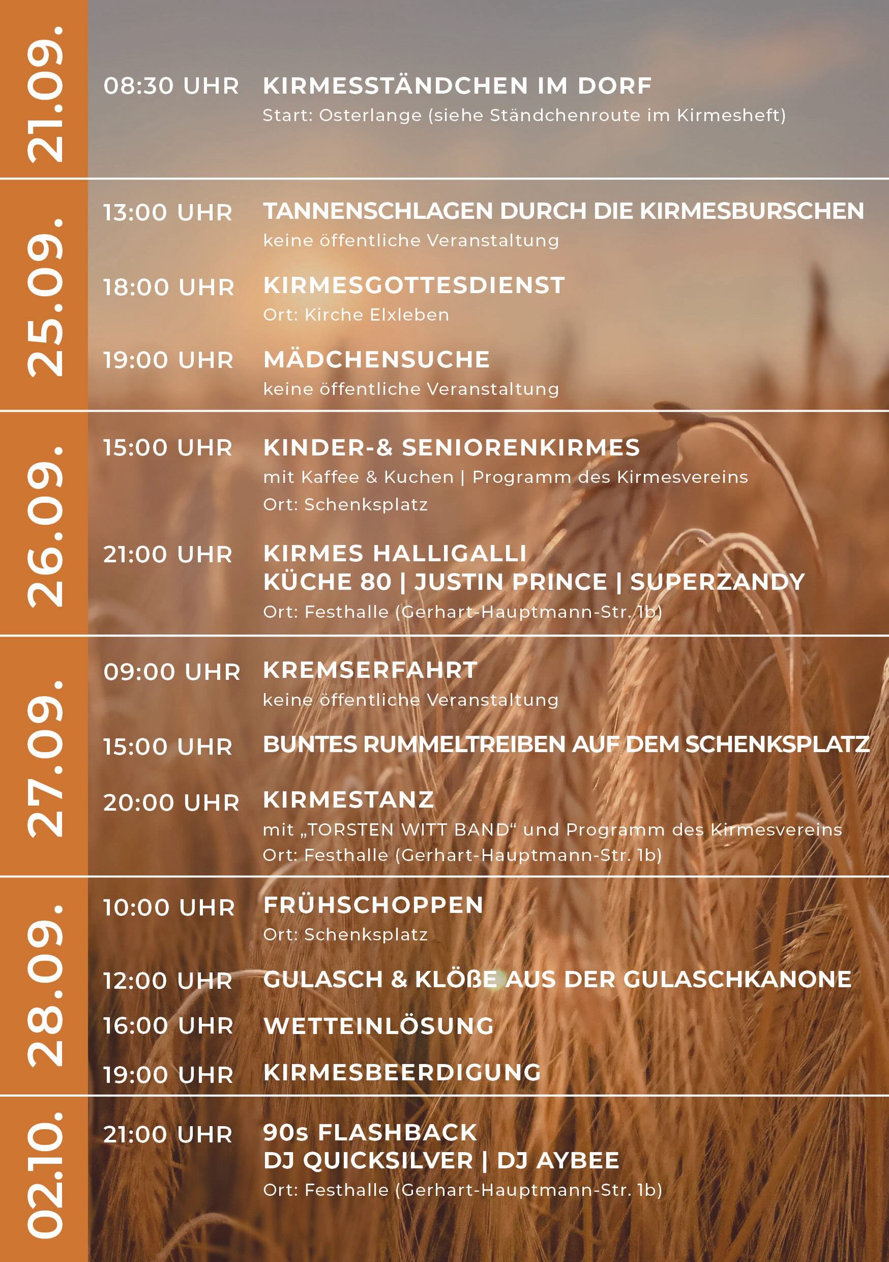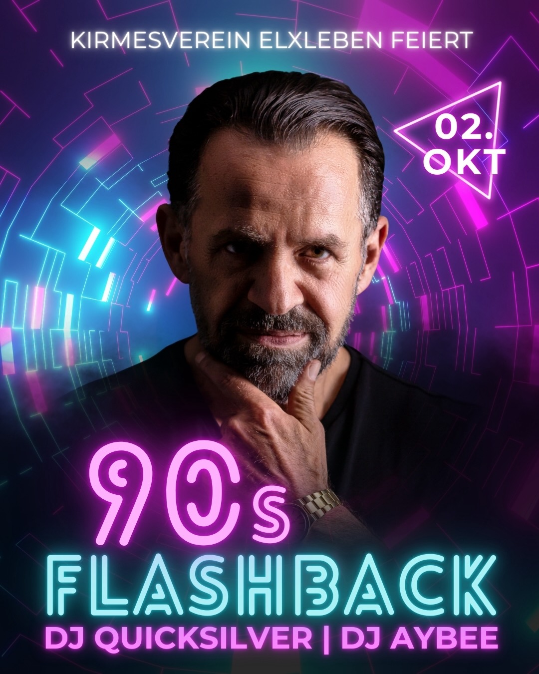 Zu beachten ist, dass die Elxlebener Kirmes mit zwei Besonderheiten aufwartet: Die traditionellen Ständchen, die den Elxlebenern gebracht werden, gibt es bereits am Sonntag, 21. September. Am Abend vor dem Tag der Deutschen Einheit lädt der Verein nochmals in die Festhalle zu „90s Flashback!“. Die Besucherinnen und Besucher erwartet eine Zeitreise in die Ära von Neonlichtern, Eurodance, Trance und unvergesslichen Klassikern, die eine ganze Generation geprägt haben.
