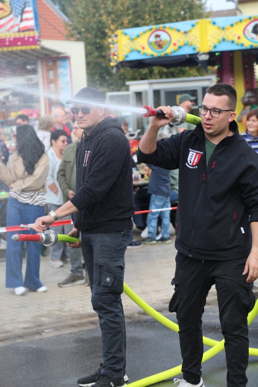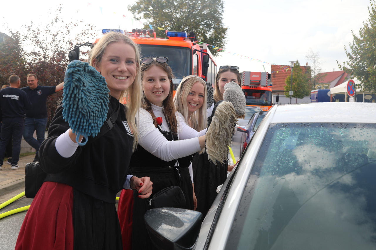 Und die Damen? Sie eröffneten mit Unterstützung der Freiwilligen Feuerwehr die wohl weltschönste Waschstraße auf dem Platz. Wer immer das wollte, konnte sein Auto – oder auch sein Fahrrad – hier in die Kur nehmen lassen.