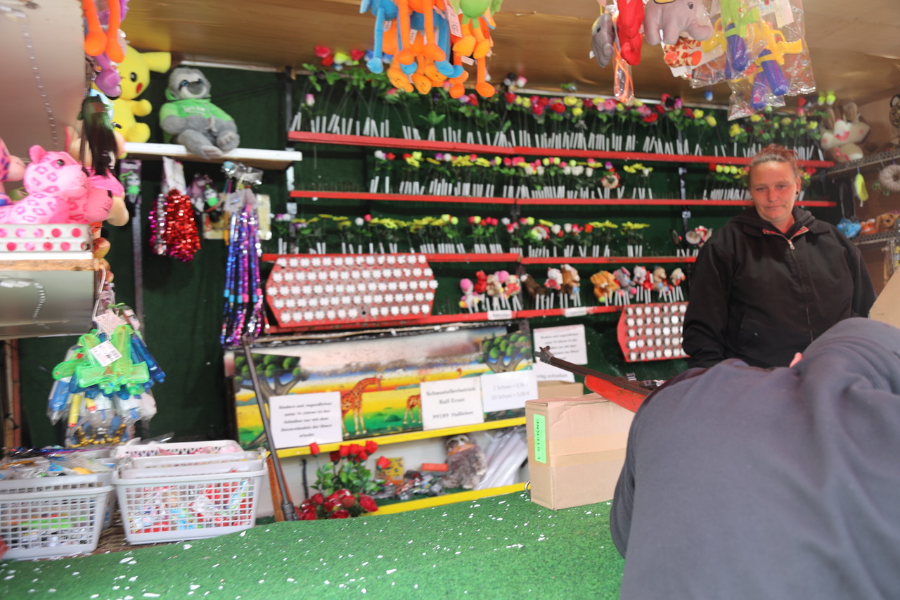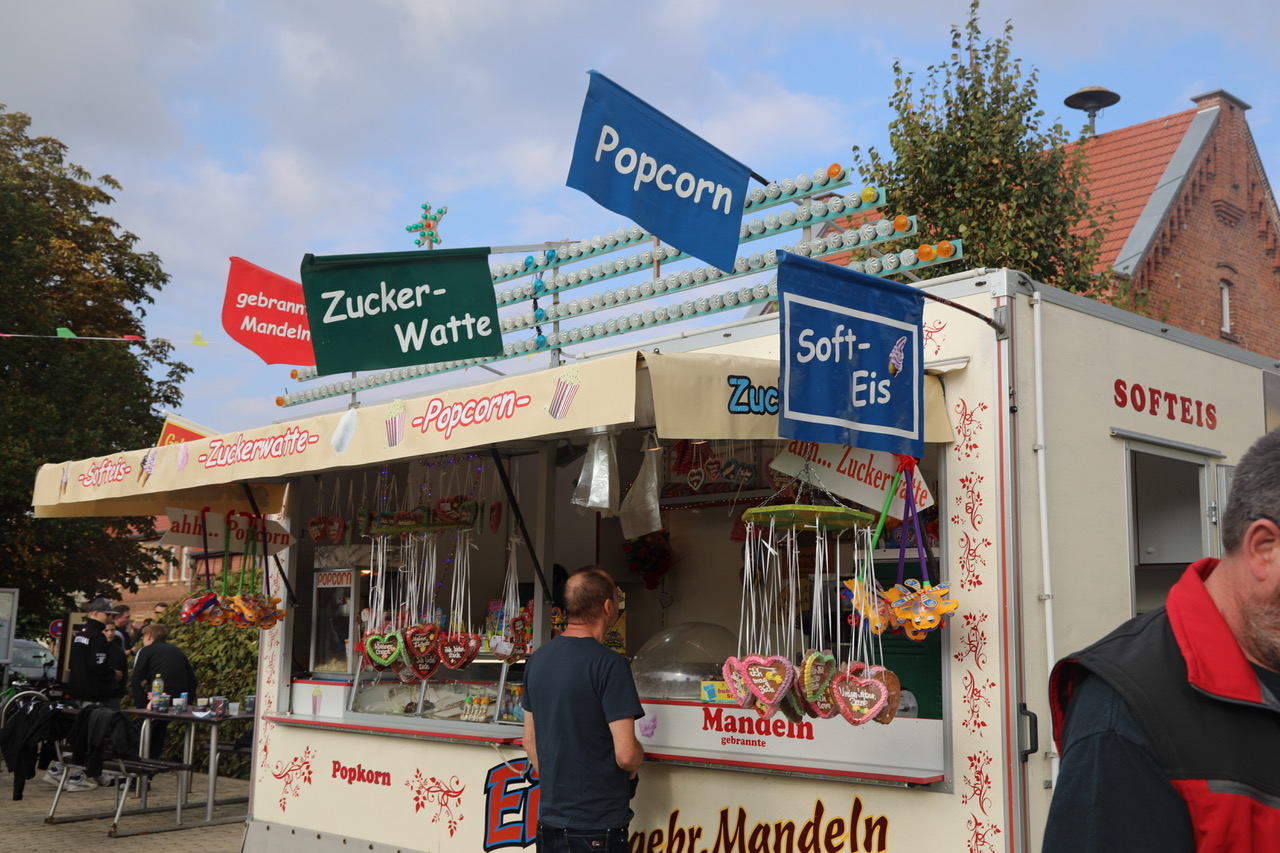 Das Wetter am eigentlichen Kirmeswochenende war zunächst regnerisch-ungemütlich. Am Sonntag endlich hatte Petrus ein Einsehen mit den aktiven Organisatoren und sorgte für eine angenehme Outdoor-Atmosphäre. Und so zog es viele Besucher auf den Kleinwinternheimer Platz zu Musik, Unterhaltung, vielen Ständen und – zur Einlösung der inzwischen ebenfalls zur Tradition gewordenen Saalwette a la „Wetten, dass …“. Beim Kirmes-Tanz hatte das Publikum Kirmesburschen und -mädels zu Wohltaten verpflichtet: Während die Männer zum Einpacken der Waren im EDEKA-Markt verpflichtet wurden, sollten die Damen alle Autos auf dem Parkplatz waschen, deren Fahrer dies wünschten. Weil am Sonntag der Markt aber geschlossen und mithin der Parkplatz leer ist, sponserte  EDEKA für einen mobilen Stand auf dem Kleinwinternheimer Platz Waren. Der Erlös aus dem Verkauf geht an den Förderverein der Regelschule Elxleben, der neue Projekte in Angriff nehmen will.