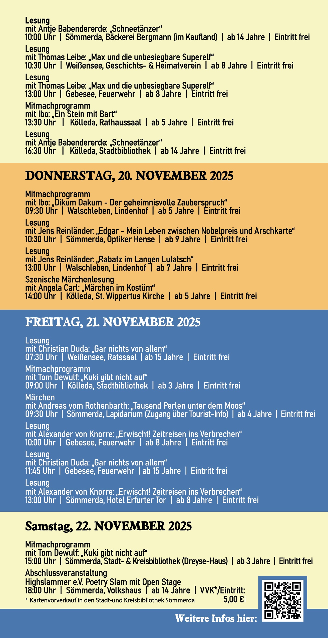 Walschleben, Gebesse, Sömmerda, Kölleda, Weißensee bieten ungewöhnliche  Veranstaltungsorte. Initiatoren sind der Friedrich-Bödecker-Kreis für Thüringen e.V und die Kreis- und Stadtbibliothek Sömmerda.