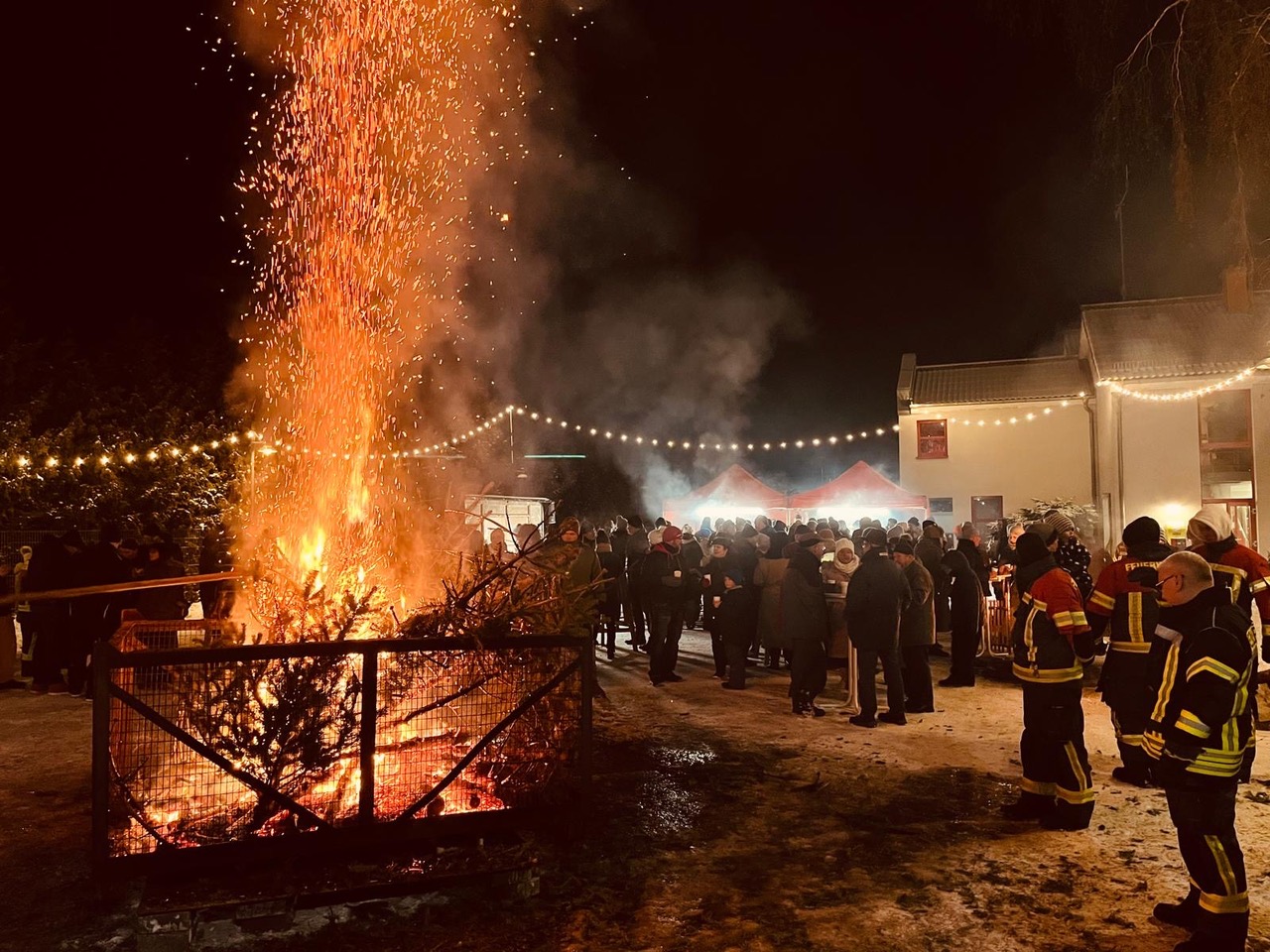 Die knistertrockenen, ausgedienten Weihnachtsbäume, gingen in imposanten Flammen auf. Kirmesburschen und Mitglieder der Freiwilligen Feuerwehr und ihres Vereins hatten sie am Morgen im Dorf eingesammelt. Bei Glühwein und frisch Gegrilltem konnte man sich – am Feuer wärmend – treffen, unterhalten, Gemeinsamkeit genießen. Besonders schön war das Winterwetter, das das schöne Flair des Festes unterstrich. Viele Gäste konnten die Veranstalter begrüßen.